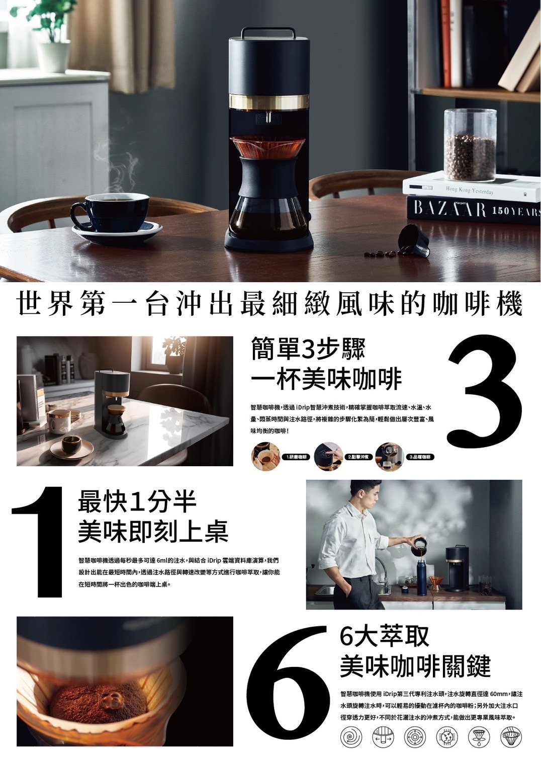透過 iDrip智慧沖煮技術,精確掌握萃取流速、水溫、水量、悶蒸時間與注水路徑,將複雜的步驟化繁為簡,輕鬆做出層次豐富、風味均衡的手沖咖啡!透過科技,用最單純的萃取方式,讓味蕾感受不同產地、烘焙度、處理法的咖啡風味!